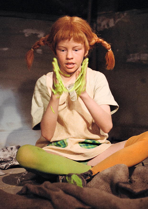 Ein Kind mit roten Haaren, Pippi Langstrumpf versucht, grüne Farbe auf ihren Händen zu verteilen, während sie auf dem Boden sitzt und kreativ ist. Es ist ein inspirierender Moment des Spielens und Schaffens.