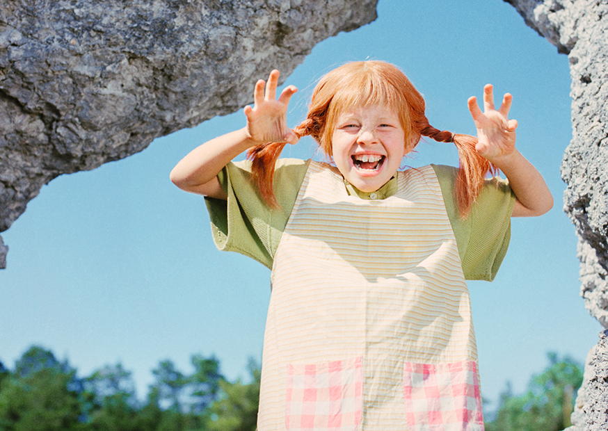 Ein Mädchen mit roten Zöpfen, Pippi Langstrumpf lacht herzlich und zeigt eine spitzbübische Grimasse. Sie steht zwischen zwei großen Felsen und genießt die Freiheit im Freien.