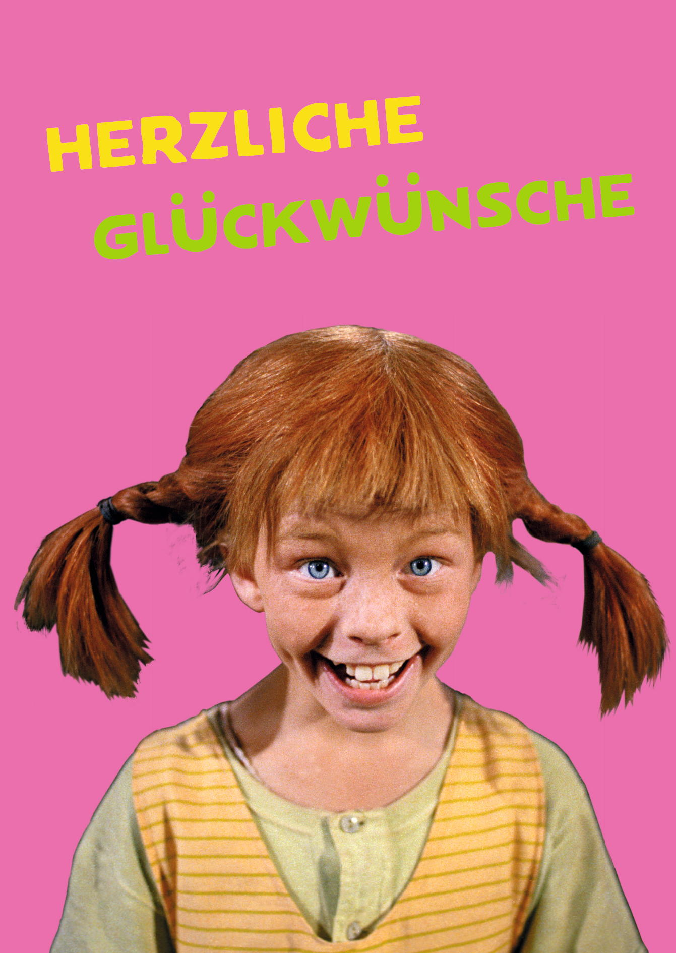 Das Mädchen mit roten Haaren und Zöpfen, Pippi Langstrumpf strahlt Freude aus. Sie trägt ein gestreiftes Oberteil und schaut direkt in die Kamera, um Glückwünsche zu übermitteln.