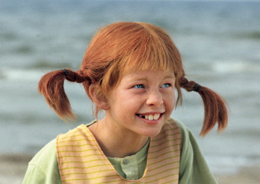 Das Mädchen, mit rotem Haar in zwei Zöpfen, Pippi Langstrumpf genießt den Strandtag und lächelt dabei enthusiastisch. Die Wellen des Meeres sind im Hintergrund sichtbar.