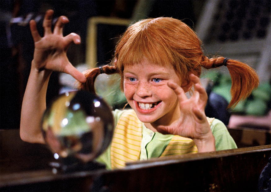 Ein fröhliches Mädchen mit roten Zöpfen und Sommersprossen, Pippi Langstrumpf setzt sich gespannt über eine glänzende Glaskugel. Es ist ein bunter, kreativer Raum voller Spielzeug.