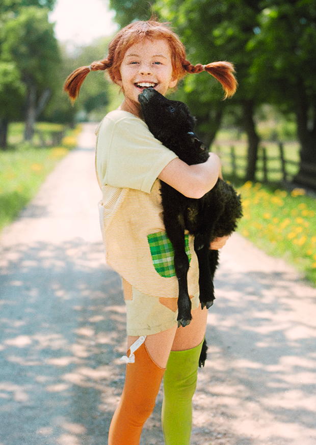 Ein Mädchen mit Zöpfen, Pippi Langstrumpf lächelt und hält einen schwarzes Kalb auf einem sonnigen, ländlichen Weg umgeben von Blumen und Bäumen.