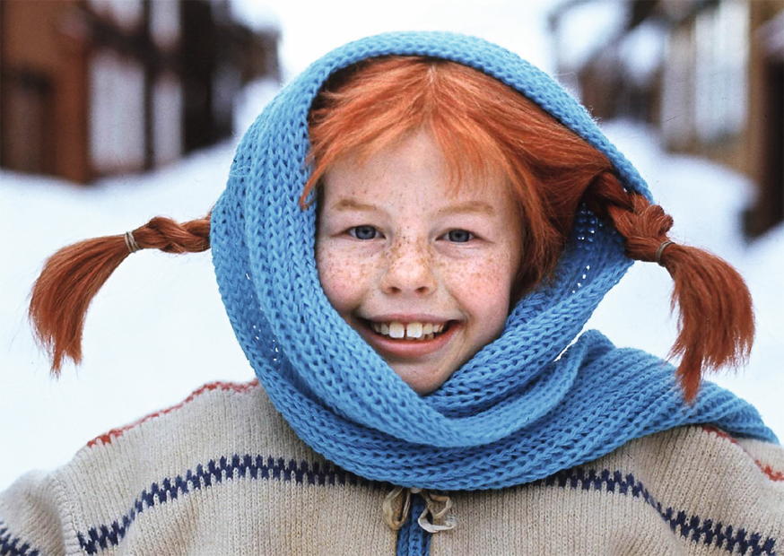 Ein aufgeregtes Kind mit roten Haaren und Sommersprossen, Pippi Langstrumpf trägt eine blaue Mütze und genießt den kalten Wintertag, während es in der verschneiten Umgebung spielt.
