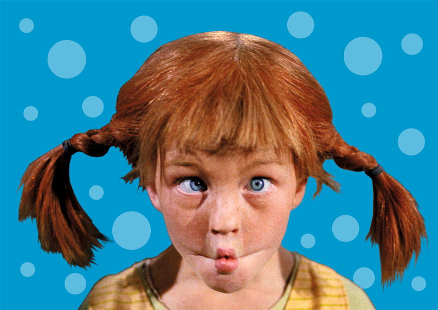 Ein kleines Mädchen mit roten Haaren und Zöpfen, Pippi Langstrumpf macht einen lustigen Gesichtsausdruck und scheint überrascht. Der Hintergrund ist hellblau mit vielen Kreisen.