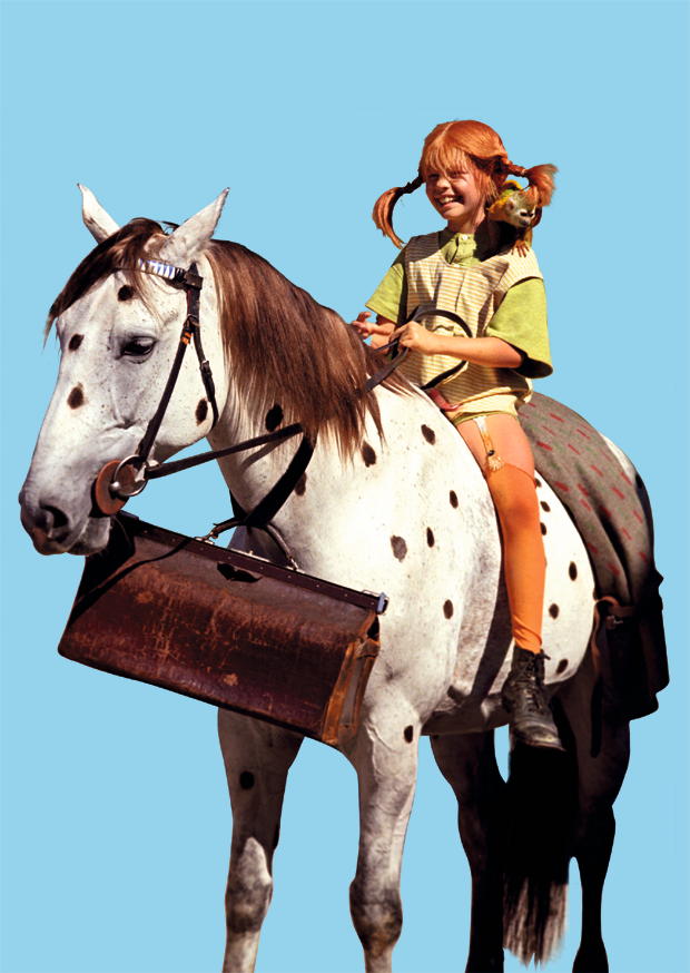 Ein kleines Mädchen, Pippi Langstrumpf, das auf einem gefleckten Pferd reitet und eine große Tasche trägt. Der blaue Hintergrund hebt die beiden hervor und schafft eine fröhliche Stimmung.