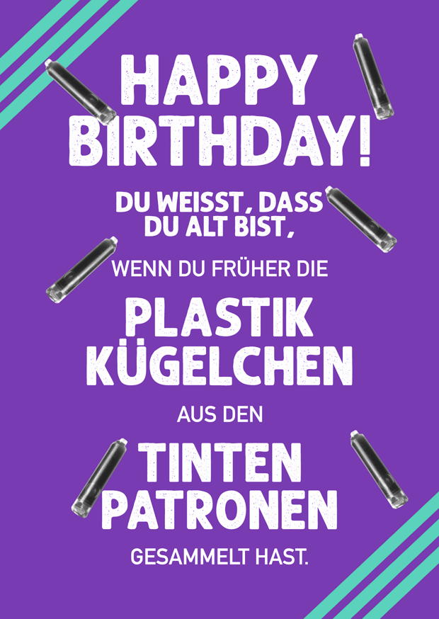 Eine fröhliche Geburtstagsbotschaft erinnert an die Kindheitserinnerungen mit Plastikkügelchen aus Tintenpatronen, geeignet für alle, die Spaß an persönlichen Geburtstagsfeiern haben.