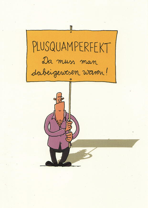 Ein humorvoller Cartoon zeigt einen Mann mit einem Schild, das Plusquamperfekt sagt. Dabei wird auf eine unterhaltsame Art und Weise auf die deutsche Grammatik hingewiesen.