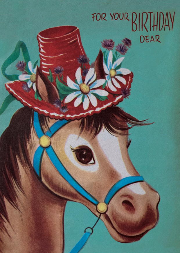 Das Bild zeigt ein süßes Pferd mit einem dekorativen Hut, verziert mit Blumen, das perfekt für einen Geburtstagsgruß geeignet ist.