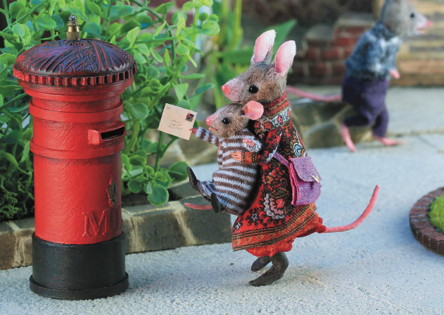 Eine Maus mit einem bunten Kleid und einer Tasche hält ein anderes kleines Tier im Arm. Gemeinsam stehen sie vor einem roten Briefkasten und scheinen einen Brief abzugeben.