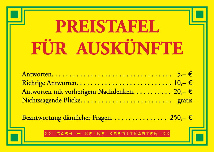 In einem gemütlichen Café hängt eine Preistafel, die Preise für verschiedene Arten von Auskünften humorvoll auflistet, darunter kostenlose und kostenpflichtige Antworten.