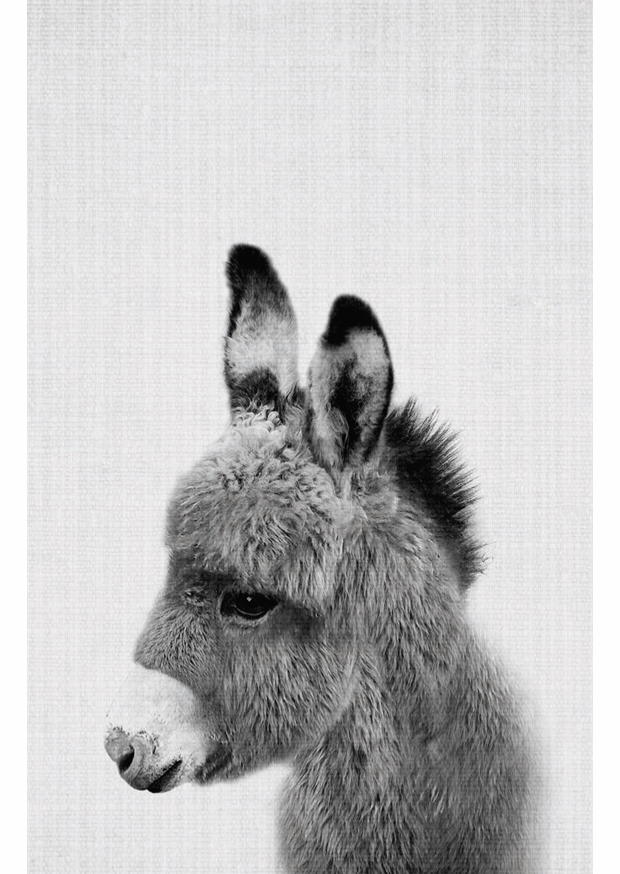 Der Esel schaut neugierig zur Seite, während sein weiches Fell im Licht schimmert. Die sanften Merkmale und großen Ohren ziehen alle Blicke auf sich.