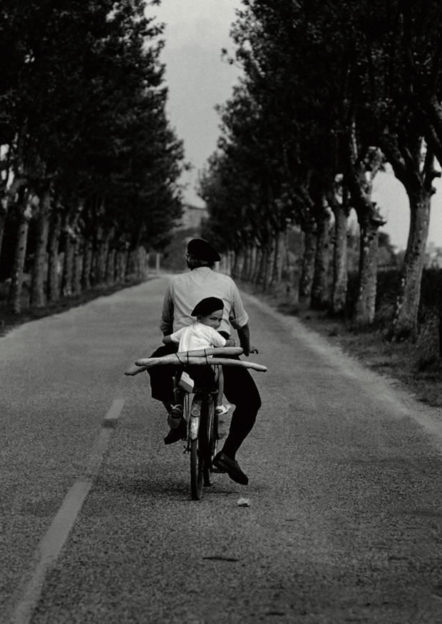 Ein Radfahrer fährt mit einem Kind auf dem Gepäckträger auf einer ruhigen, baumgesäumten Straße im Freien, umgeben von Natur und Frieden.