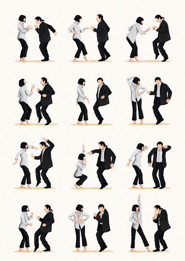 Zwei Personen tanzen energisch miteinander. Der Mann im Anzug und die Frau in eleganter Kleidung zeigen eine Reihe von dynamischen Tanzbewegungen in einem hellen Raum.