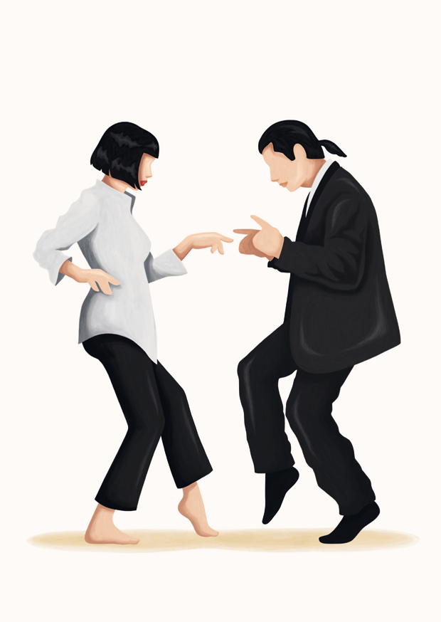 Zwei Personen tanzen fröhlich miteinander. Die Frau trägt eine lockere Bluse und die Hose, während der Mann in einem dunklen Anzug gekleidet ist. Die Atmosphäre ist lebhaft und ausgelassen.