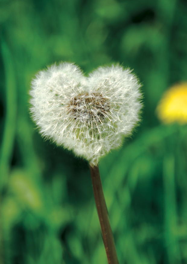 Ein Löwenzahn stellt seine einzigartigen herzförmigen Samenstände zur Schau, während er in der Frühlingssonne auf einer blühenden Wiese steht.