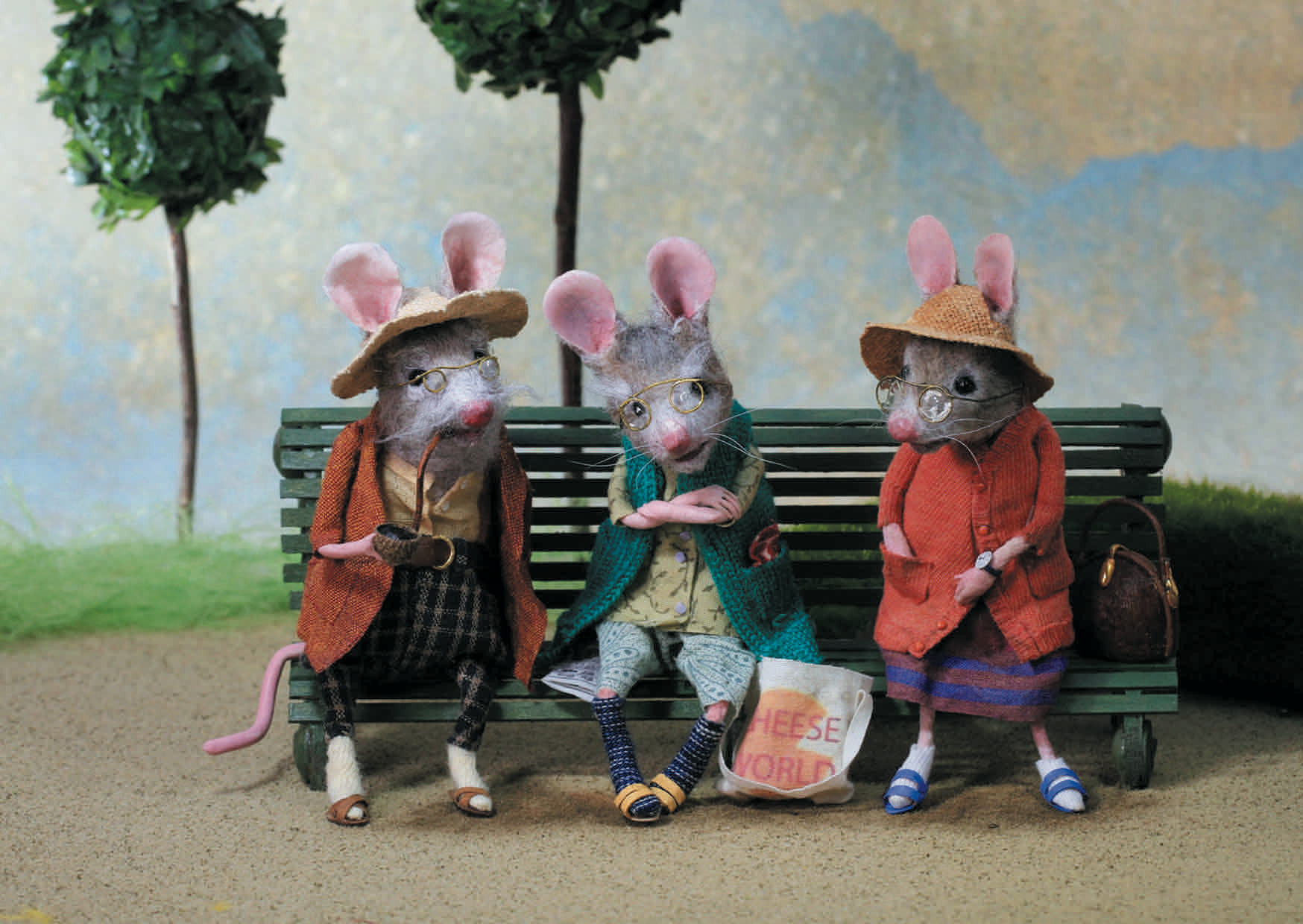 Drei handgefertigte Mäuse in bunten Kleidern sitzen auf einer Bank im Park. Sie scheinen sich angeregt zu unterhalten und genießen den sonnigen Tag.