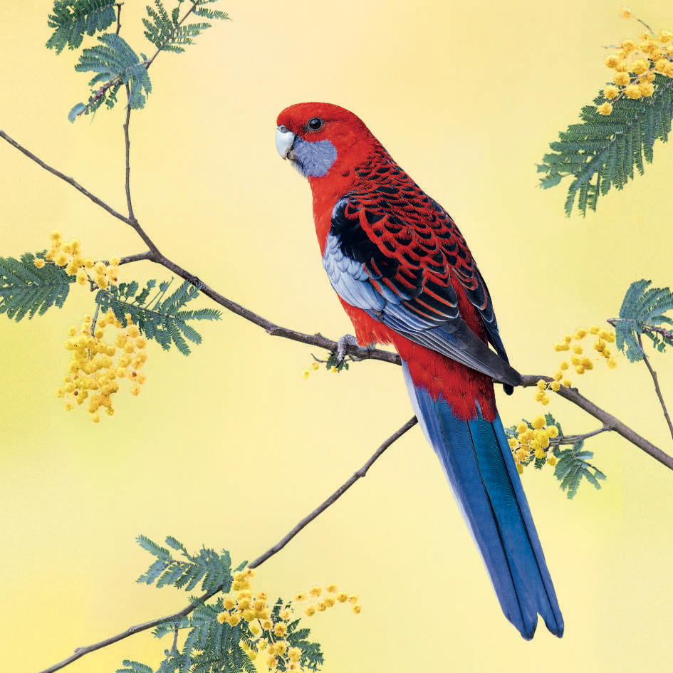 Der Rotkopf-Papagei ist auf einem Ast mit leuchtend gelben Blüten platziert. Sein Gefieder strahlt in kräftigen Farben und er genießt die ruhige Umgebung.