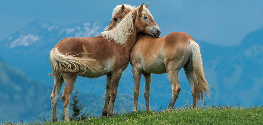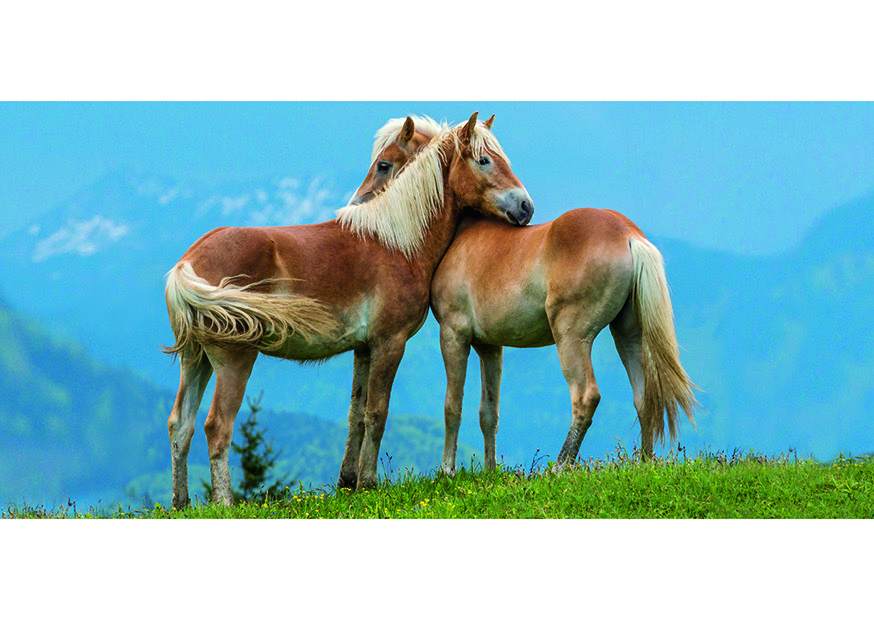 Zwei Pferde stehen auf einer grünen Wiese in den Alpen und zeigen Zuneigung zueinander, während im Hintergrund Berge und ein klarer blauer Himmel sichtbar sind.