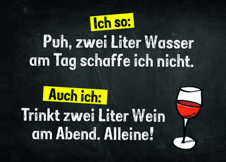 Zwei Personen besprechen humorvoll ihren fehlenden Erfolg bei der Wasseraufnahme und die Voraussetzung, abends allein Wein zu trinken.