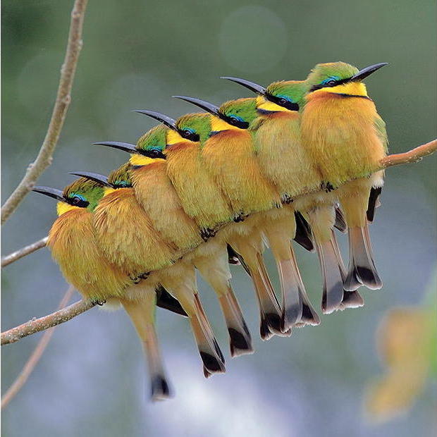 Sechs lebendige Vögel mit grünem und gelbem Gefieder sind auf einem Ast versammelt und blicken aufmerksam in verschiedene Richtungen, während sie die Umgebung erkunden.