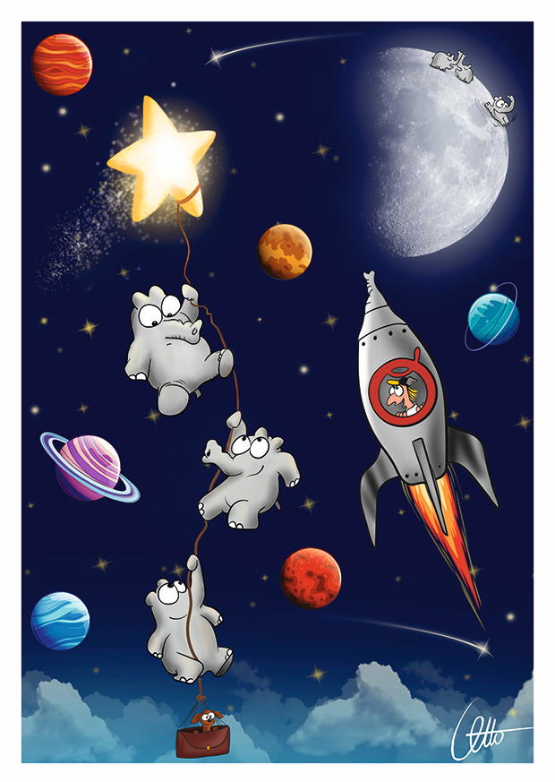 Drei niedliche Tiere schwingen an einem Faden zu einem leuchtenden Stern, während ein Raumschiff mit einem freundlichen Charakter die Planeten erkundet.