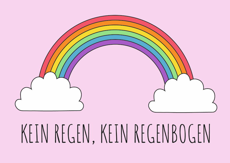 Ein kreatives Motiv mit einem Regenbogen und zwei Wolken auf einem pinken Hintergrund vermittelt die Botschaft, dass Herausforderungen notwendig sind, um schöne Dinge zu sehen.
