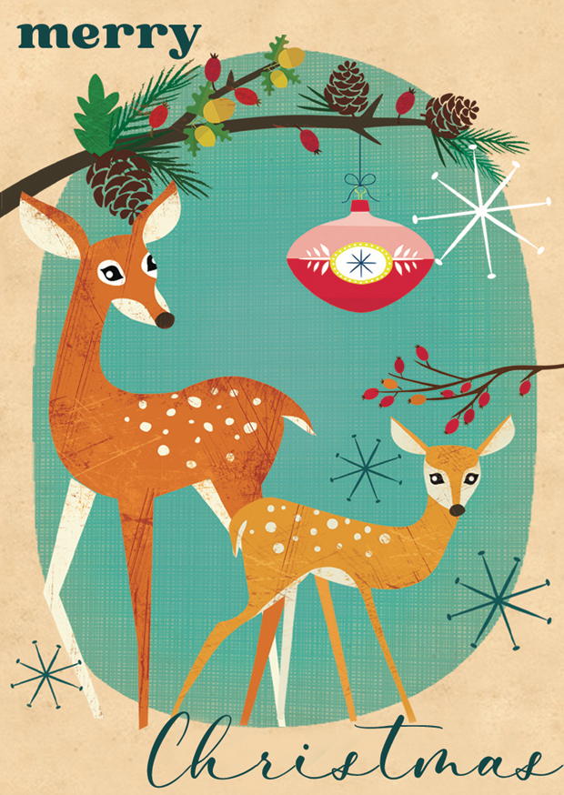 Zwei detaillierte Rehe stehen zusammen unter einem geschmückten Weihnachtsbaum, umgeben von festlichen Elementen und einer fröhlichen Atmosphäre.