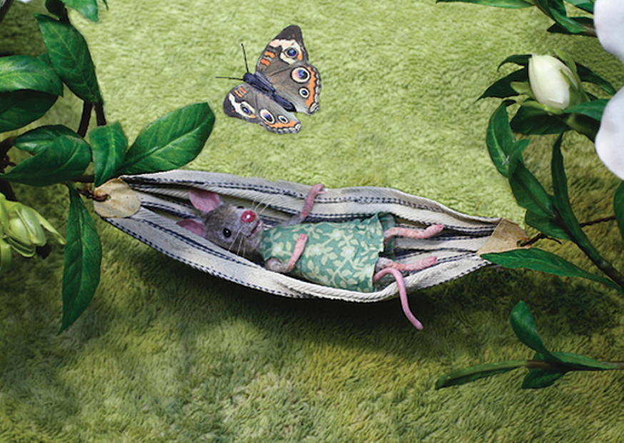 In einem Garten genießt eine kleine Maus, gekleidet in einem hübschen Kleid, die Sonne, während sie in einem bunten Stoffboot schaukelt und von einem Schmetterling besucht wird.