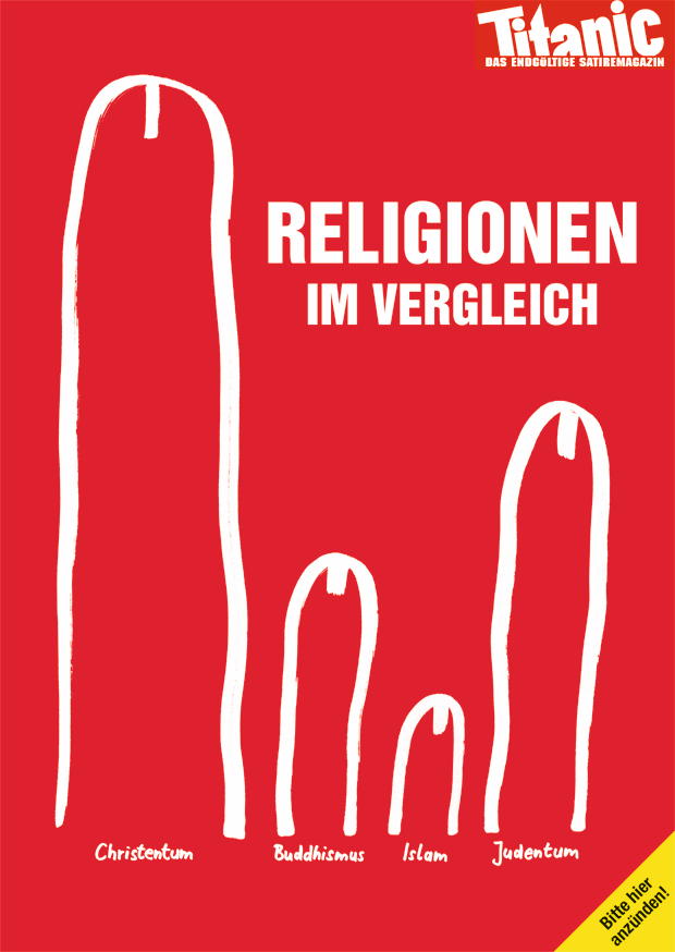 Auf rotem Hintergrund sind künstlerisch stilisierte Symbole der Religionen Christentum, Buddhismus, Islam und Judentum angeordnet, die ihre Unterschiede verdeutlichen.