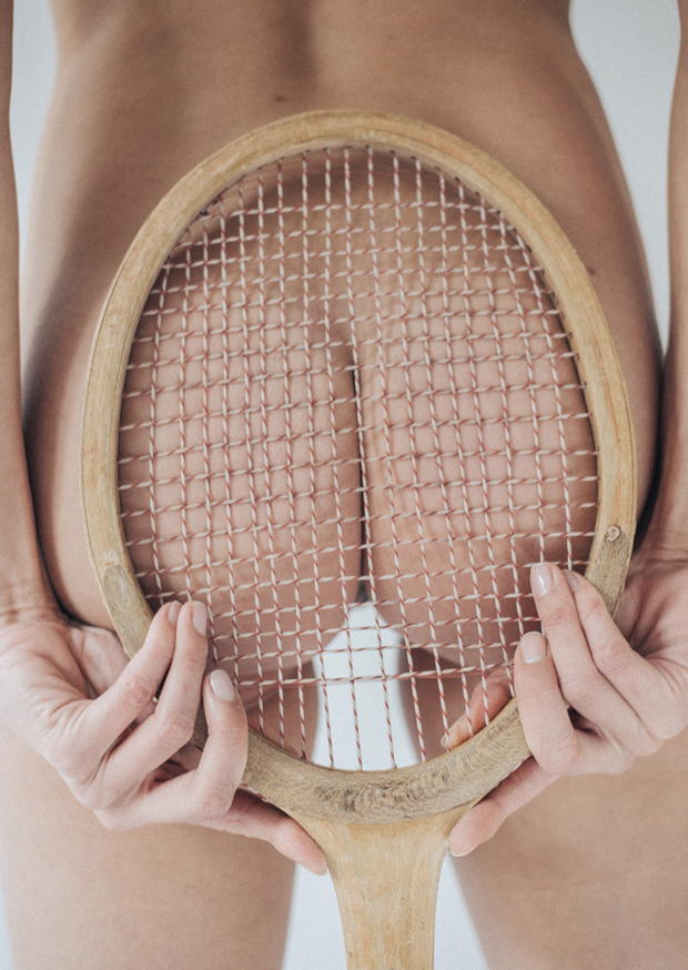 Eine Person posiert nackt und hält einen vintage Tennisschläger hinter ihrem Körper, der in einem hellen, minimalistischen Raum aufgenommen wurde.
