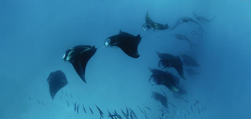 Unterwasser schwimmen mehrere Mantas in Formation durch transparentes Wasser, umgeben von kleinen Fischen im Korallenriff. Ein beeindruckendes Schauspiel der Natur.