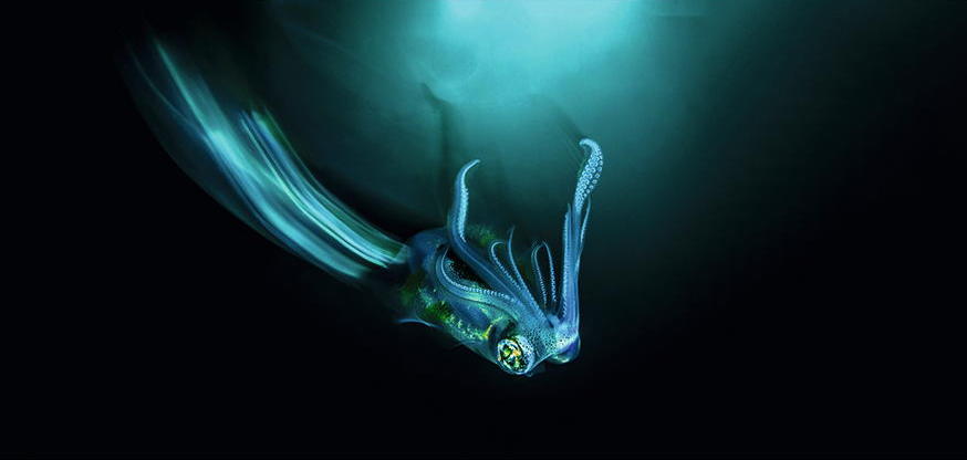 Der Oktopus bewegt sich geschmeidig durch die dunklen Gewässer der Tiefsee. Sein Körper leuchtet schwach und zeigt seine erstaunlichen Farben und Muster.
