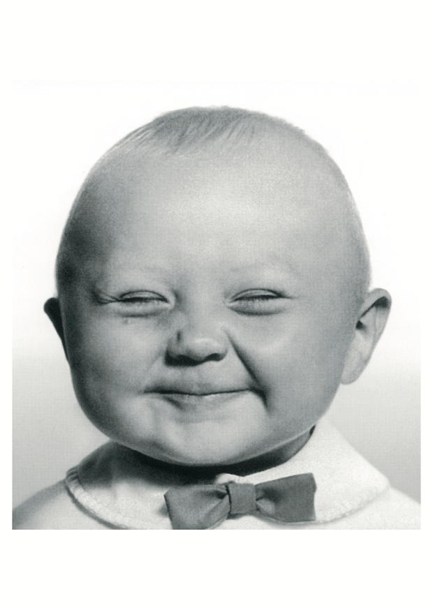 Das Baby zeigt ein breites Lächeln und strahlt Freude aus. Der Blick ist direkt in die Kamera gerichtet, was eine herzliche Verbindung schafft. Es trägt eine bezaubernde Schleife.