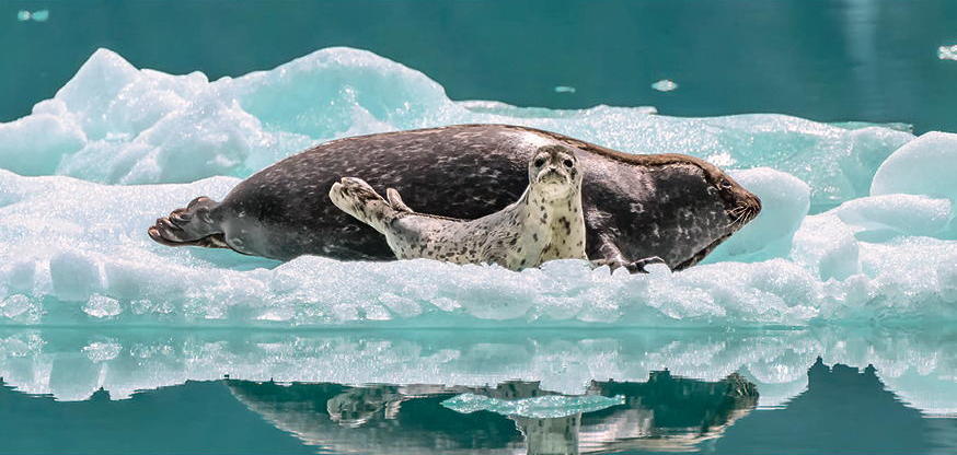 Eine Robbe und ihr Jungtier liegen entspannt auf einer Eisscholle, umgeben von glitzerendem, klarem Wasser in einer ruhigen arktischen Landschaft.