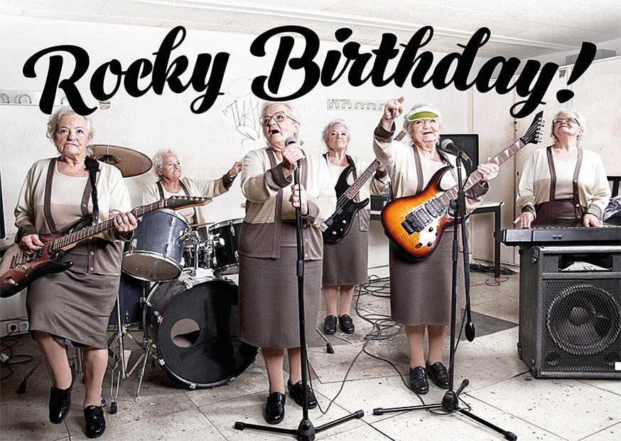 Eine Gruppe älterer Frauen steht auf der Bühne und spielt leidenschaftlich Rockmusik. Sie feiern einen Geburtstag und begeistern das Publikum mit ihrem Auftritt und ihrer Energie.