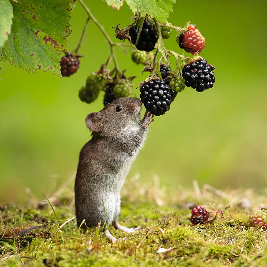 Eine kleine Maus steht aufrechten Beinen und greift nach saftigen, schwarzen Beeren in einem üppigen Wald. Die Wiese ist mit Moos bedeckt und die Blätter der Pflanzen sind grün.