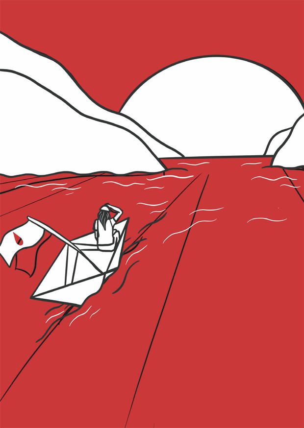 Eine Person sitzt in einem kleinen Boot und rudert auf einem rot gefärbten Wasser. Im Hintergrund erhebt sich eine große, weiße Sonne über den minimalistischen Hügeln.