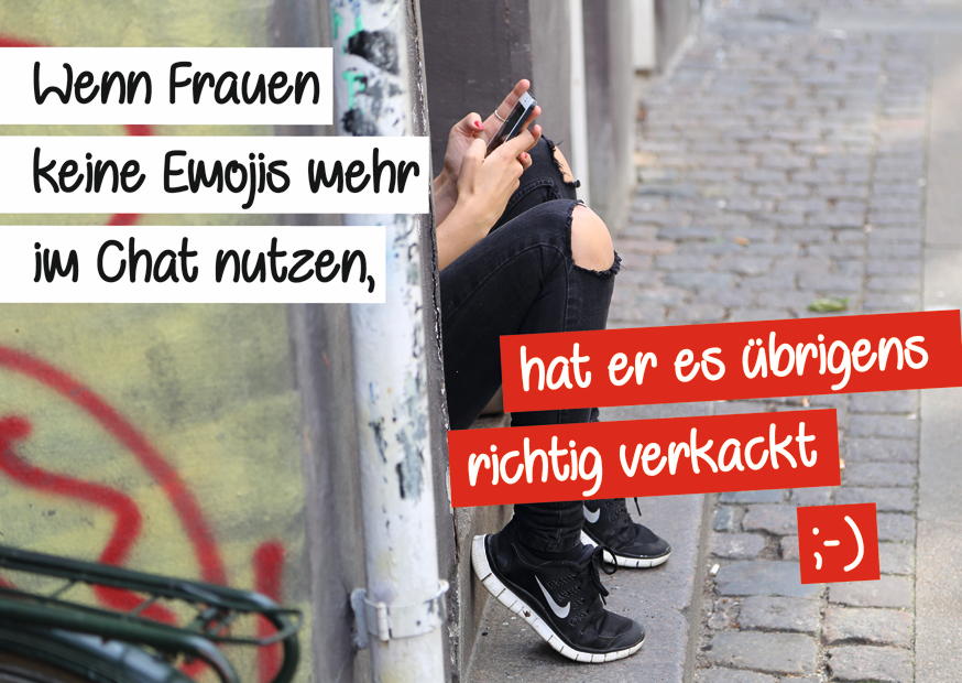 Eine Frau sitzt an einer Mauer und schaut auf ihr Smartphone, während sie über die ohne Emojis geführte Kommunikation nachdenkt. Der Hintergrund zeigt urbane Elemente.