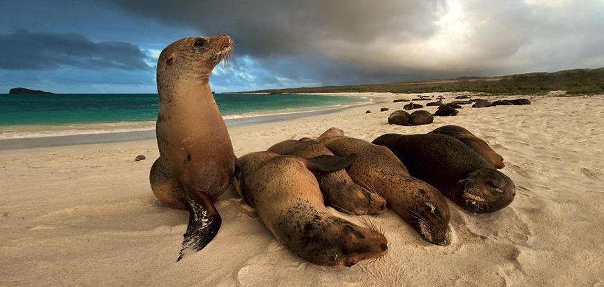 Eine Gruppe von Seelöwen liegt entspannt auf dem Sandstrand der Galápagos-Inseln. Der Himmel ist bewölkt und die Wellen plätschern sanft am Ufer.