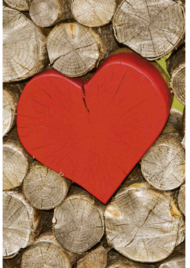 Ein rotes Herz aus Holz ist zwischen Ästen und Scheiten platziert. Es trägt die Zeichen der Zeit und steht im Kontrast zur natürlichen Umgebung.