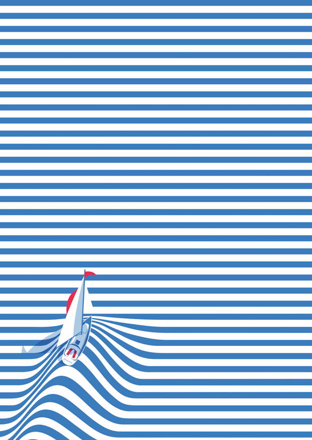 Ein kleines Segelboot fährt durch sanfte Wellen, während blaue und weiße Streifen den Hintergrund prägen. Es ist ein ruhiger Tag auf dem Wasser.