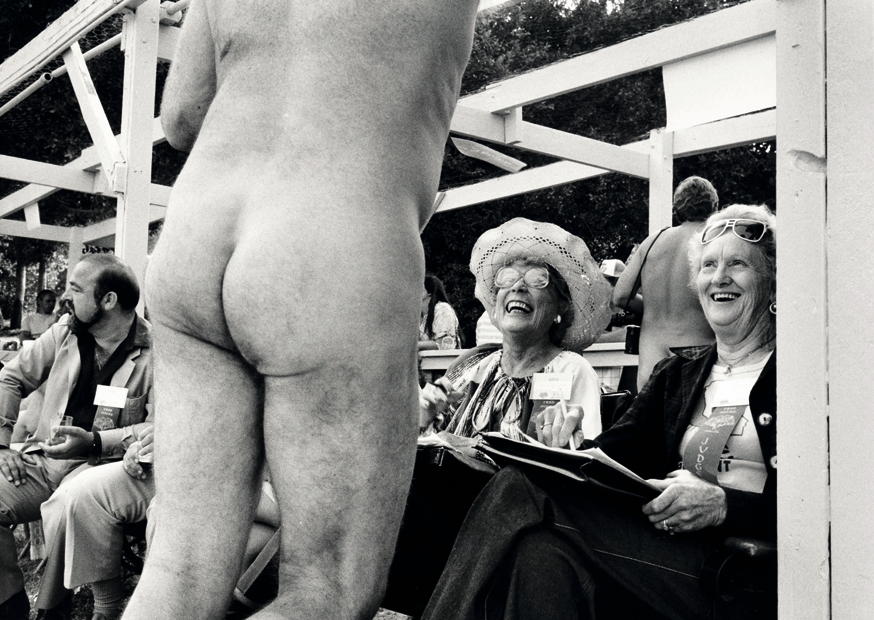 Zwei fröhliche ältere Frauen sitzen auf einer Tribüne und genießen eine unterhaltsame Veranstaltung, während ein nackter Mann in der Nähe auftritt. Ihre Lachen ist ansteckend.