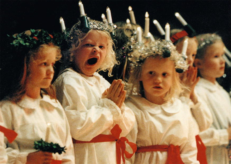 Eine Gruppe von Kindern in festlicher Kleidung feiert das Lucia-Fest. Einige halten Kerzen, während ein Mädchen sich gähnt und die anderen aufmerksam sind.