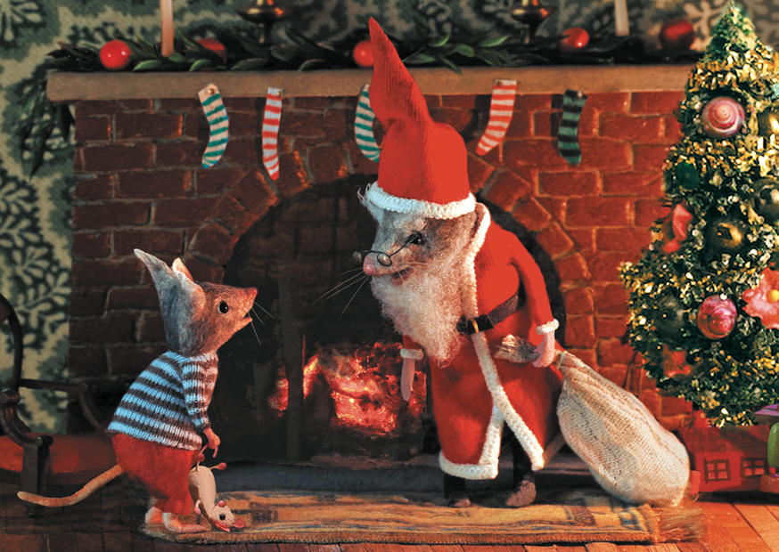Eine Maus in einem gestreiften Shirt trifft den Weihnachtsmann vor einem warmen Kamin. Der Weihnachtsmann trägt einen roten Anzug und hält einen Geschenkesack in der Hand.