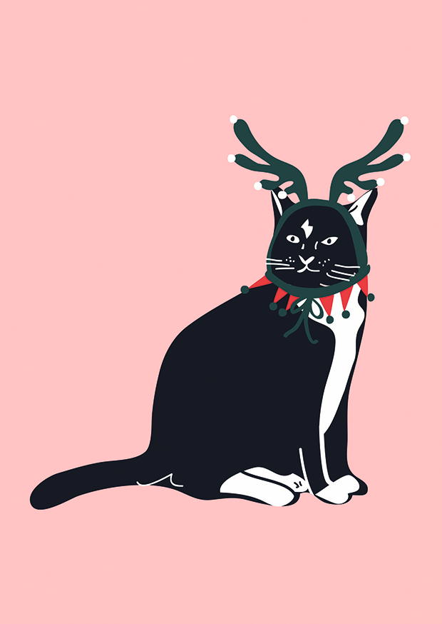 Die Katze trägt ein kreatives Rentierhorn und weihnachtlichen Schmuck um den Hals. Der rosa Hintergrund verleiht der festlichen Stimmung einen zusätzlichen Charme.