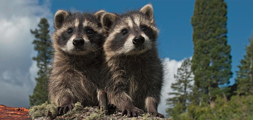 Zwei junge Waschbären stehen neugierig auf einem Baumstamm im Wald und schauen sich um. Es ist ein heller, sonniger Nachmittag mit blauen Himmel und grünen Bäumen.