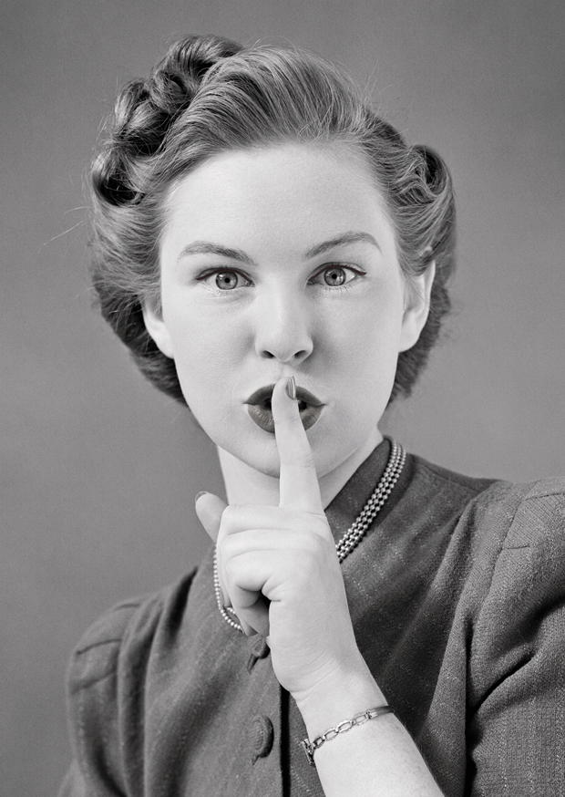 In einem klassischen Stil der 1950er Jahre zeigt eine Frau mit eleganter Frisur auf ihre Lippen, um zu signalisieren, dass Stille gewünscht ist.