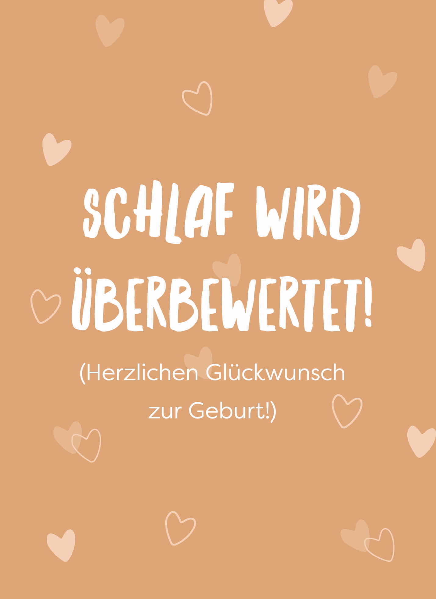 Ein kreativer Gruß zur Geburt mit dem Text „Schlaf wird überbewertet“ auf einem sanften, herzverzierten Hintergrund. Ein fröhliches und einladendes Design.