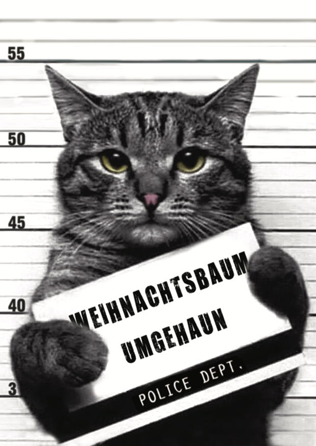 Eine Katze posiert in einer Polizeiwache und hält ein Schild in ihren Pfoten, auf dem steht, dass sie einen Weihnachtsbaum umgehauen hat. Der Streifenhintergrund verstärkt den humorvollen Effekt.