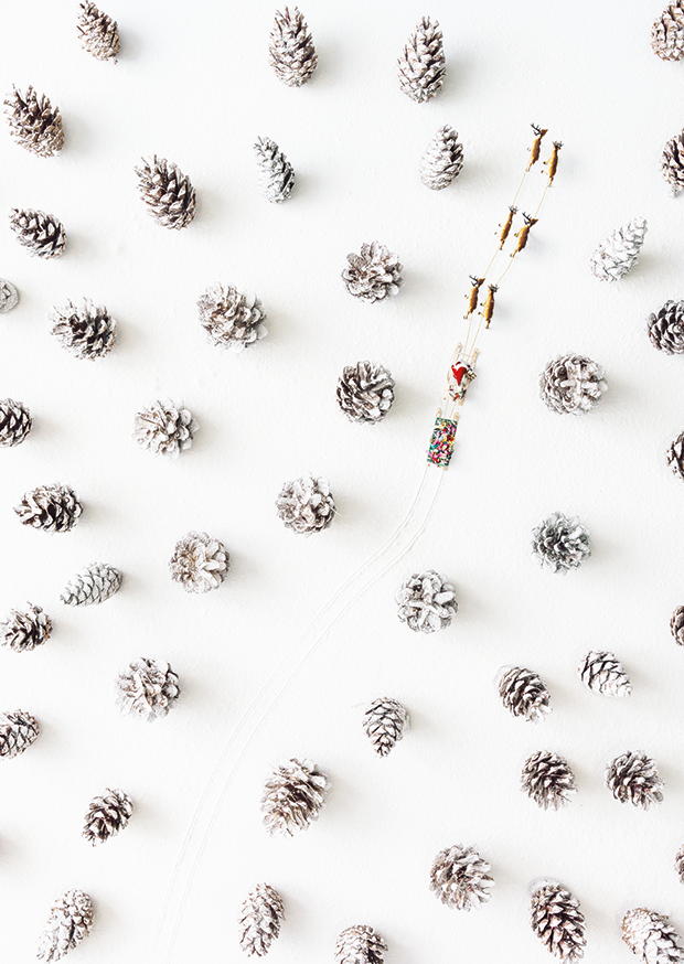 Eine Vielzahl von Tannenzapfen ist elegant auf einem weißen Untergrund angeordnet.